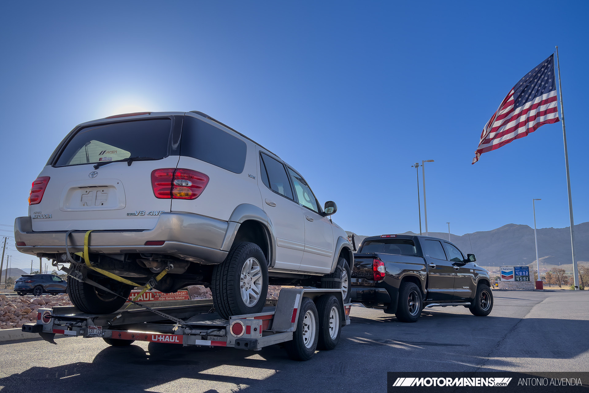 The numbers add up quickly! A typical setup includes about 2,000 pounds for the trailer + 2,600 to 4,000 pounds for the vehicle + several hundred pounds of tools, spare wheels, tires, and parts in the bed of the truck. Altogether, the total load often reaches 6,000 to 7,000 pounds rolling behind the truck. That kind of weight is exactly what the Toyota 3UR-FE 5.7L V8 was built for, and the engine handles it with confidence and ease.